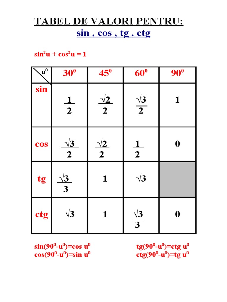 Sine cosine tangent chart improve your math fluency. Pdf trigonometrie clasa a ix a viorel danila academia edu. Α sin α cos α tan α α sin α cos α tan α α sin α cos α tan α α sin α cos α tan α o o o o 0 0,000 1,000 0,000.