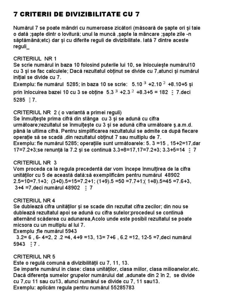 Un număr este divizibil cu 2 dacă și numai dacă are ultima cifră pară. Criteriul de divizibilitate cu 3 lovește cârtița. Un număr natural este divizibil cu 5 dacă și numai dacă ultima cifră a numărului este 0 sau 5.