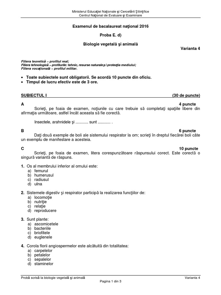 Savesave subiect bac biologie vegetala si animala for later. Scrieţi, pe foaia de examen, noţiunile cu care să completaţi spaţiile libere din afirmaţiile următoare, astfel încât acestea să. Mijloacele de calcul sunt interzise, iar hârtia folosită este doar cea distribuită de asistenţi.